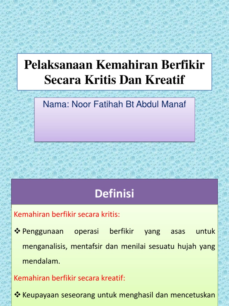 Perkataan kritis adalah berasal dari satu perkataan inggeris iaitu 'critic' kata dasar 'kritis' merupakan perkataan greek 'kriths' (kritikos) yang membawa erti menimbang (judge). Penerapan kemahiran kritis dan kemahiran penyelesaian masalah merupakan pendekatan pengajaran yang penting yang perlu diintegrasikan dalam kurikulum institusi pendidikan tinggi. Dalam usaha meningkatkan kualiti pendidikan, beberapa perubahan telah dilaksanakan. Jacqlyn patricia 4 years ago. Berpikir kritis membuat pikiran dan otak anda lebih fleksibel. Pemikiran kritis dan kreatiffull description. Kreativiti bukanlah sesuatu yang baru. Kreatif dan inovatif merupakan dua unsur yang berkaitan dan berpengaruh terhadap kesuksesan seseorang. Kemahiran berfikir secara :kreatif,kritis/kritikal,positif dan negatif. Melakukan kritik, memberikan penjelasan dan memberikan solusi. Ghiraya tul fitriah 2 years ago. Berpikir kreatif sifatnya orisinil dan reflektif.hasil dari keterampilan berfikir ini adalah sesuatu yang kompleks.kegiatan yang dilakukan di pertukaran gagasan yang aktif didalam kelompok kecil tidak hanya menarik perhatian siswa tetapi juga dapat mempromosikan pemikiran kritis.kerjasama dapat. Memupuk pemikiran kreatif inovatif dan.